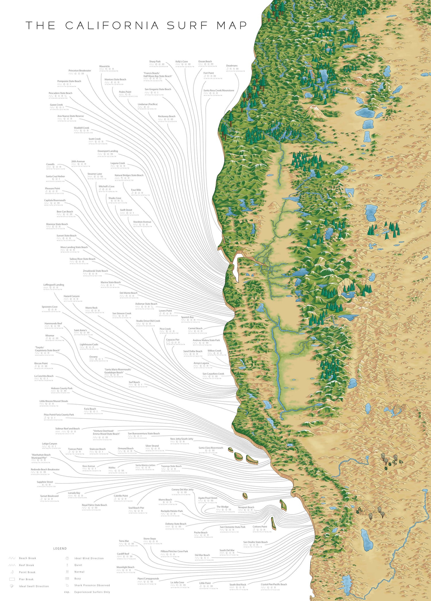 So we've captured 115 of the best surf spots and mapped them out with our unique , hand-drawn terrrain design of the state's coastline.