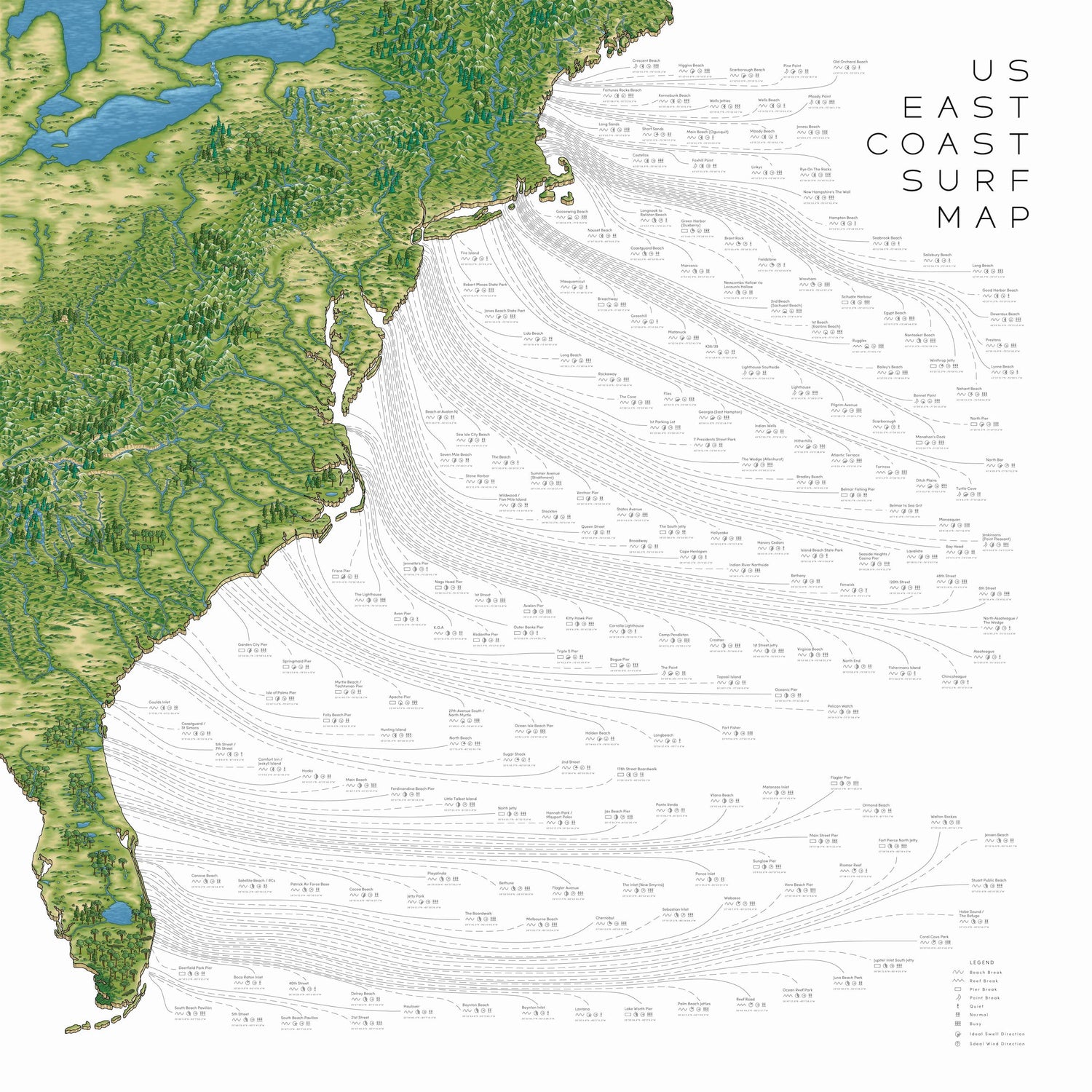 212 amazing surf spots, from Maine to Florida. GPS coordinates, crowd factor, break types and ideal swell/wind direction for every spot. This is The US East Coast Surf Map.