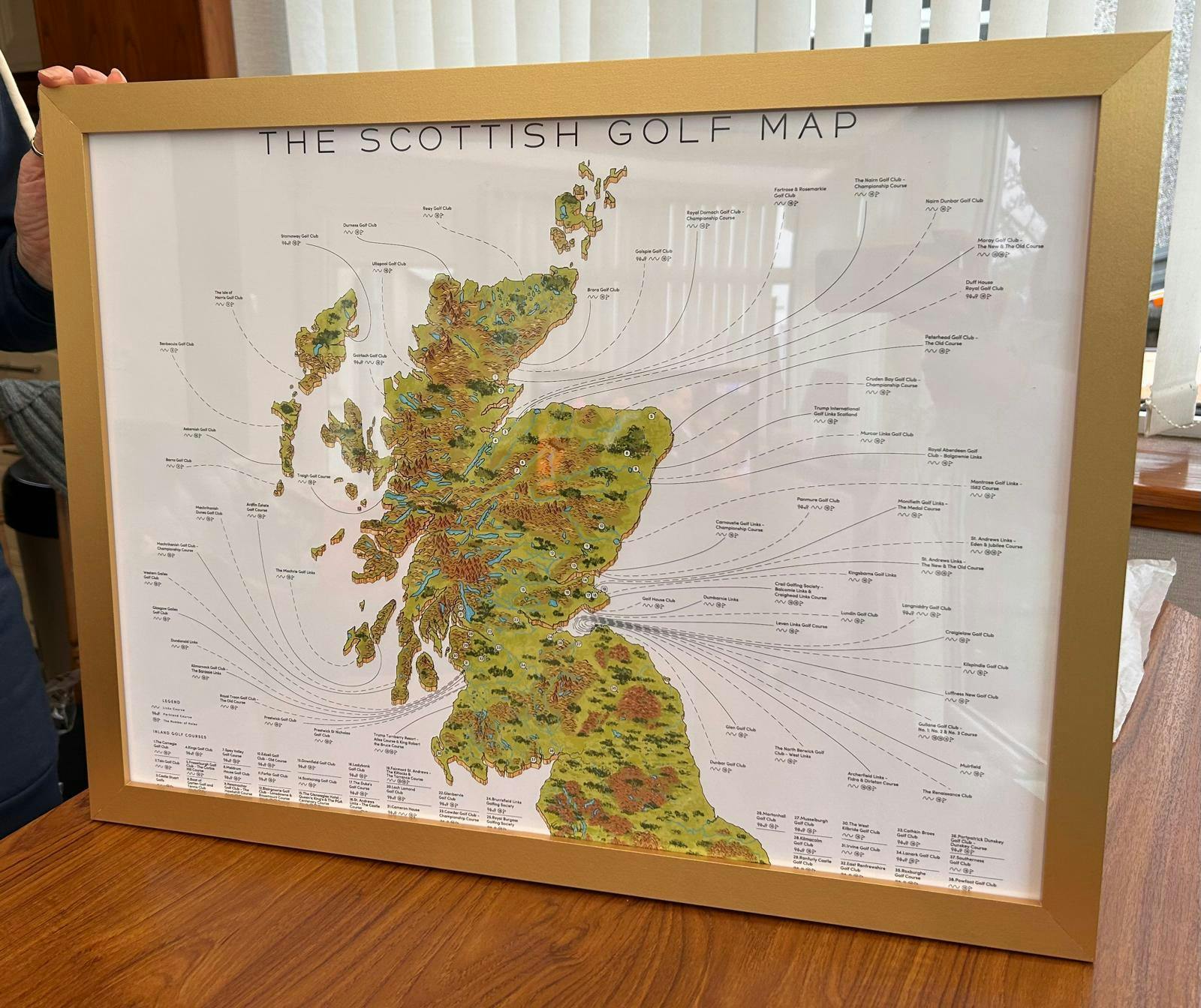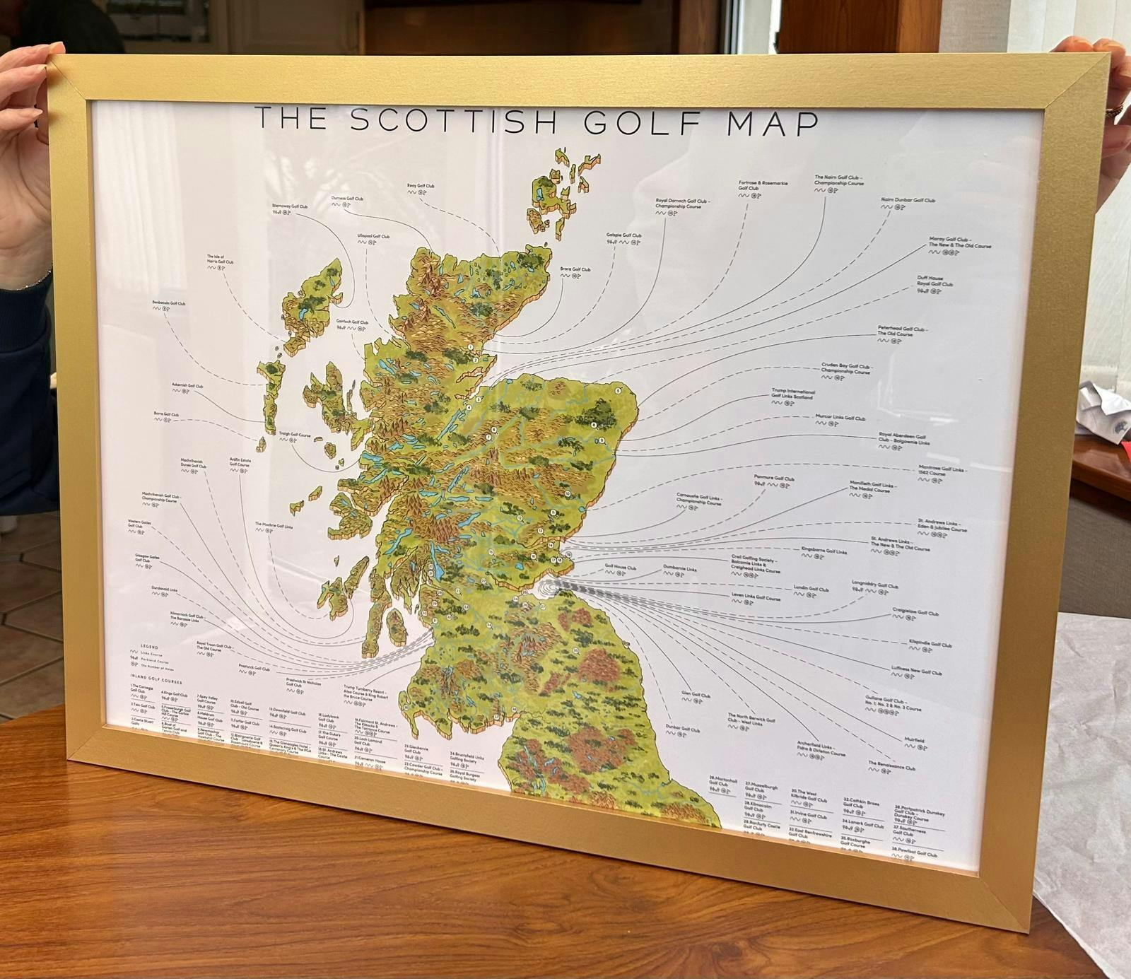 After our final round at Dumbarnie Links last July I noticed the club had map of Scotland golf with a QR code for ordering. I immediately knew I wanted to memorialize this trip. A trip that I had always dreamed of doing since an early age. I ordered the large canvas print. It arrived without issue and is proudly mounted in my home office. The print will proudly preserve great memories of great golf , great friends and the beautiful people of Scotland.