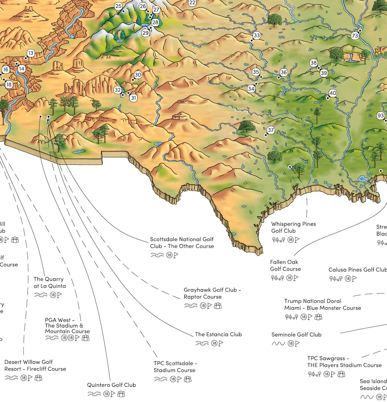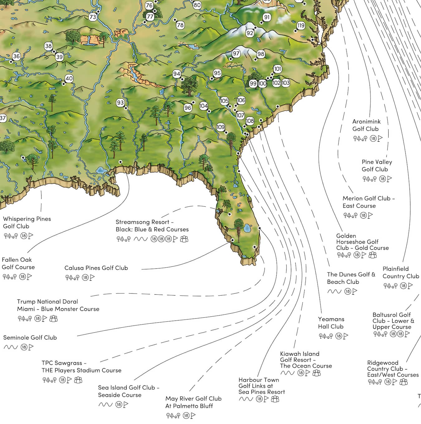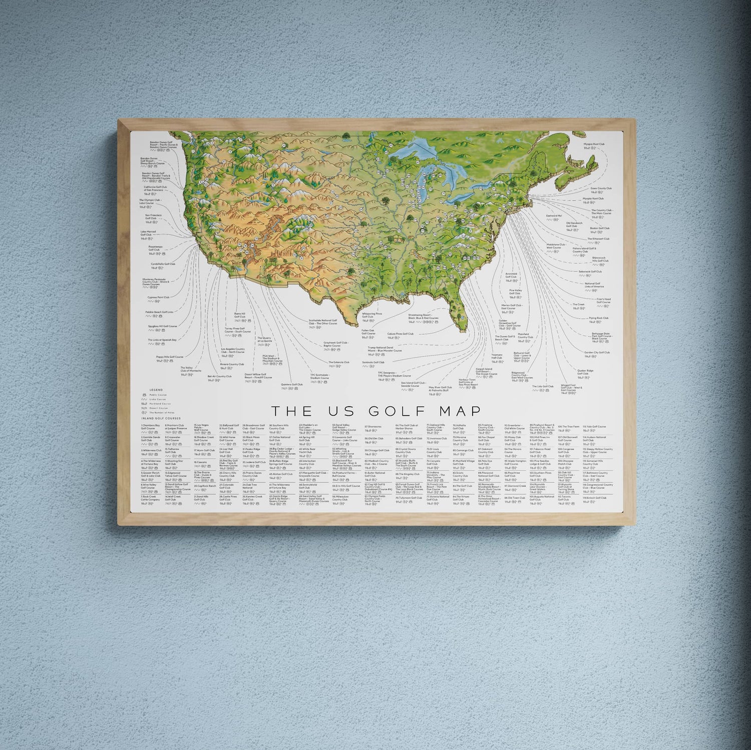 The first comprehensive, hand-drawn map of the top US golf courses - with a balance of both private & public courses. Available now as a stunning Wall Map - Get inspired to travel and play bucketlist courses around the States.