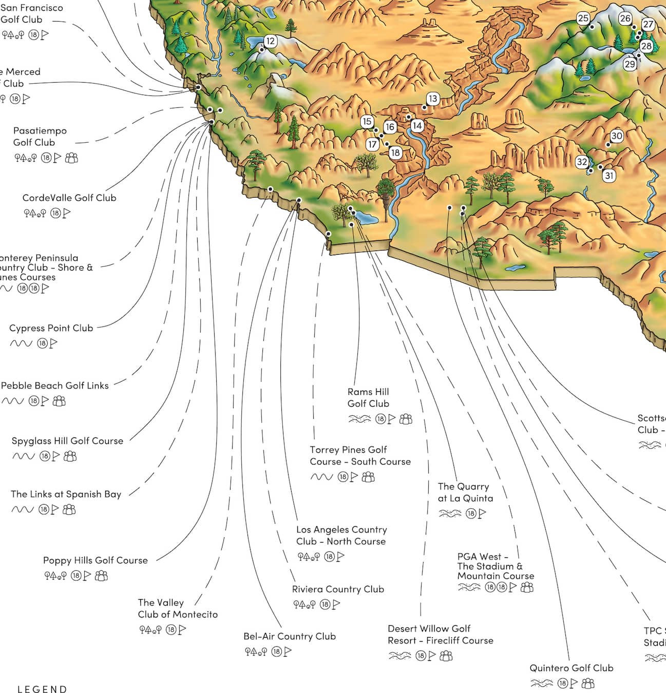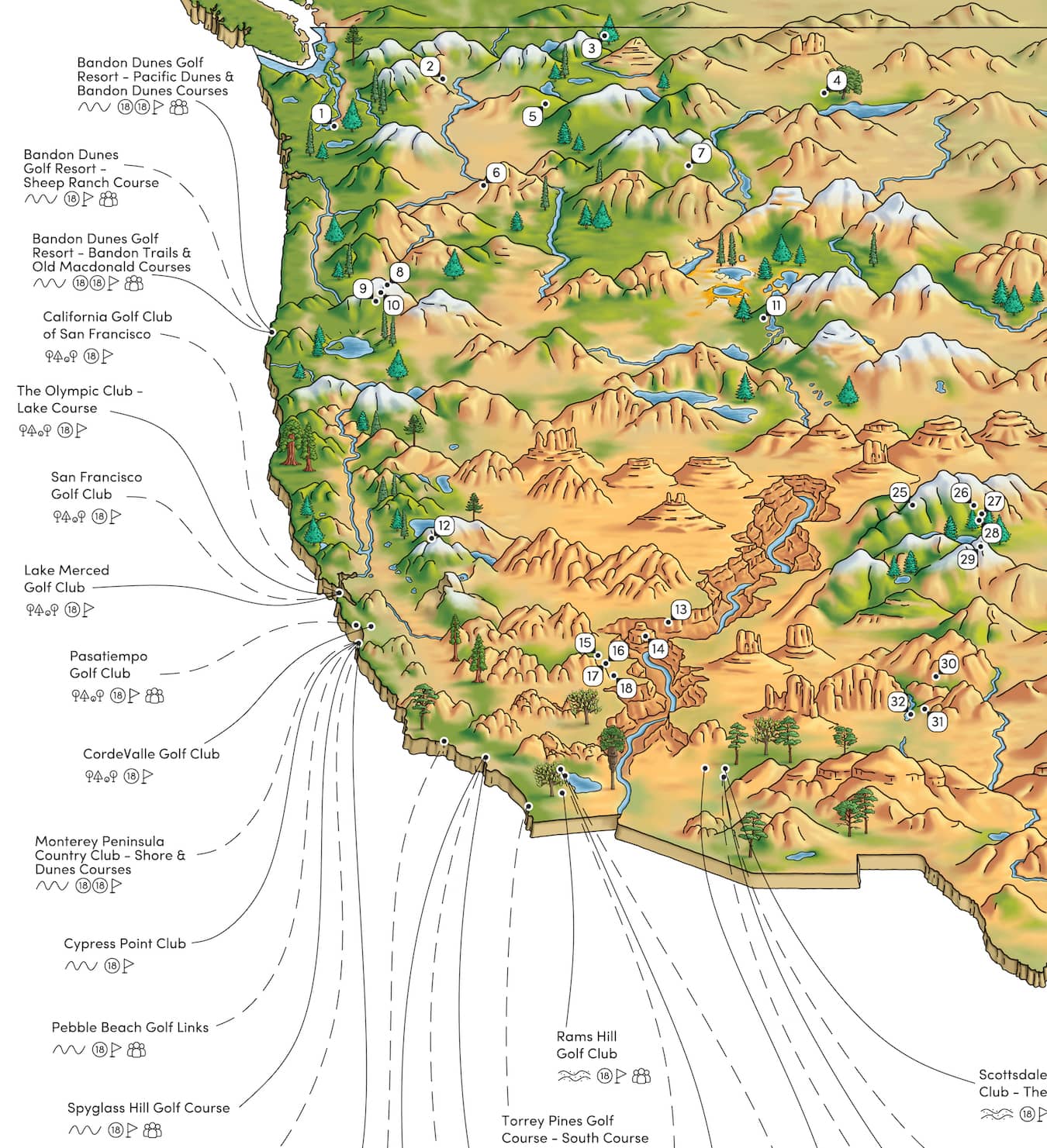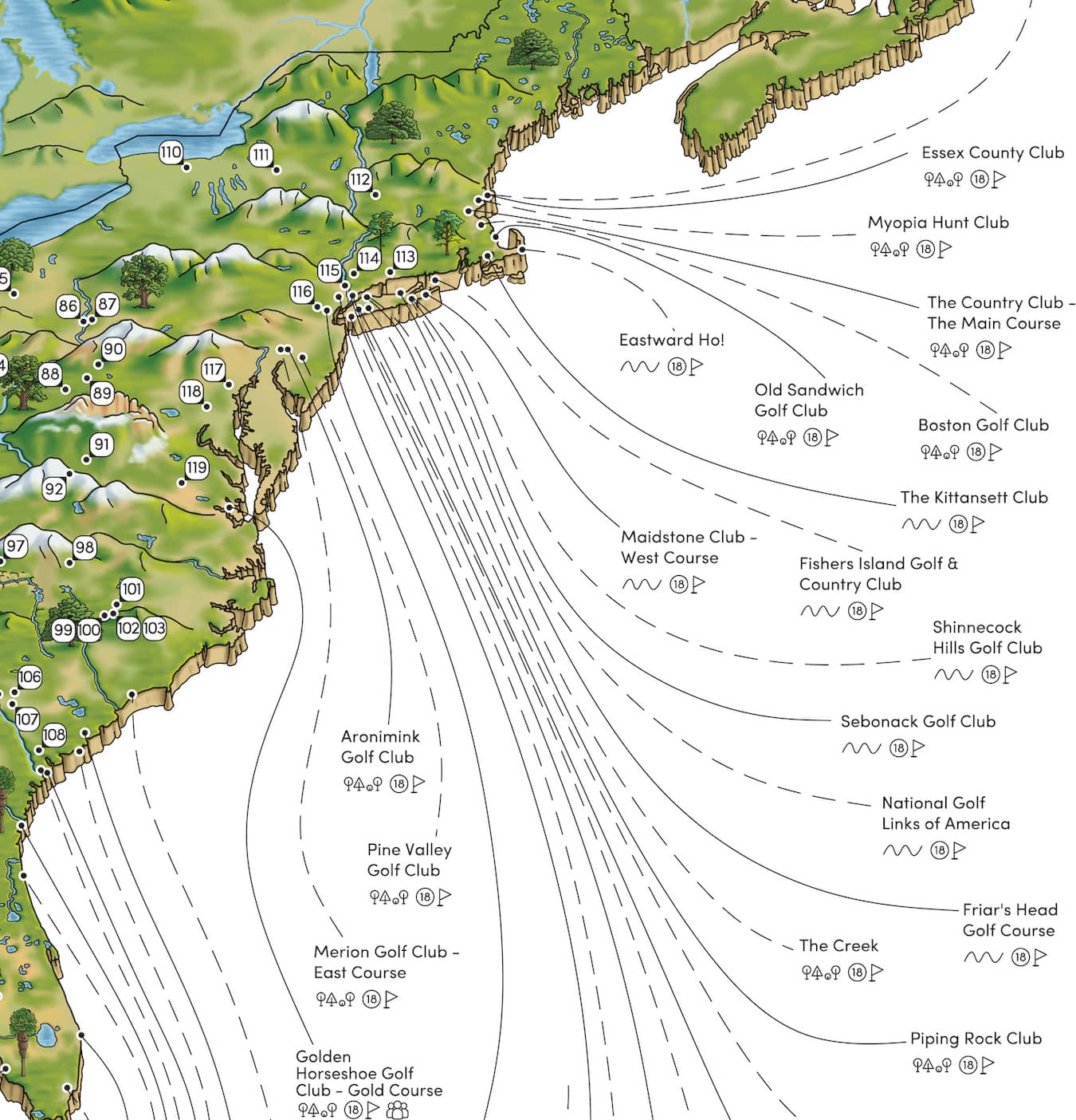 The first comprehensive, hand-drawn map of the top US golf courses - with a balance of both private & public courses. Available now as a stunning Wall Map - Get inspired to travel and play bucketlist courses around the States.